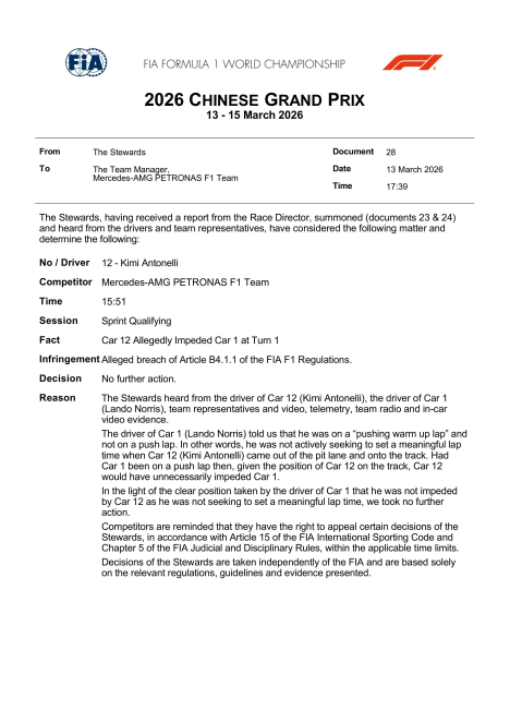 “The driver of car 1 (Lando Norris) told us he was doing a “warm-up lap” and not a flying lap – we read in the note released by the commissioners – in other words, he was not actively trying to achieve a significant time when car 12 (Kimi Antonelli) exited the pit lane and onto the track. If car 1 had been on a fast lap, given car 12’s position on the track, car 12 would have unnecessarily hindered car 1. In light of the clear position taken by the driver of car 1 that he was not being impeded by car 12 as he was not trying to achieve a significant lap time, we took no further action“.
