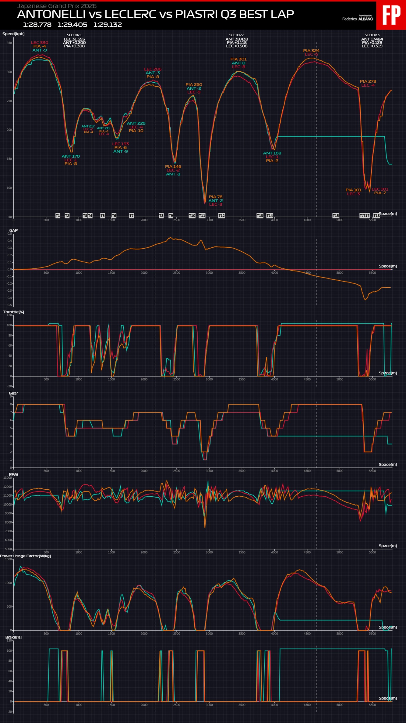Note: the data provided by the Federation continues to be incredibly irregular and incomplete. Unfortunately, on the lap that earned Antonelli pole, from the exit of the Spoon onwards his data control unit blocked as can be seen from the graph. It’s not just a problem for Mercedes but one that alternated with all the teams throughout the entire session.