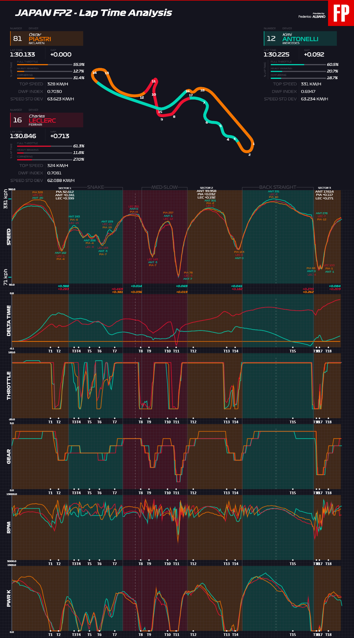 The one who certainly started off on the right foot was La Mercedes, which already appeared in its ideal operating window from the point of view of the overall set-up of the car. It is clear from the data that in the snake section Antonelli’s pace is unstoppable for his opponents, all supported by very high levels of torque in delicate points, such as the entrance to turn 3 or the climb to turn 7, up to the extension before the Spoon. The Mercedes advantage was then evident on the home straight with the highest top speed (331) and the speed at the braking point of the last chicane still higher (278), demonstrating the usual advantage in the super clipping phase. For now, the Brackley side is lacking a release of energy superior to their opponents on the main straight, we’ll see if this is something that will change in view of qualifying.