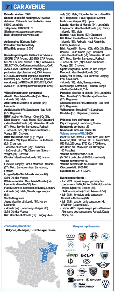 Quant à Car Avenue, il est le neuvième groupe de distribution français selon notre Top 100 au regard de son chiffre d’affaires de deux milliards enregistré en 2024. Durant cet exercice, il a écoulé plus de 33 000 VN en 2024 (+13,8 %) et 22 000 VO (+11,7 %). Il distribue 34 marques.