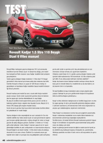 gücüne de sahip olduğunu gördüm. Özellikle 1.5 litrelik ve 110 bey- Kadjar’ın ön koltukları ve ergonomik yapısı bakımından sürüş perfor- tuşları görüp kullanabileceğimi de sanmıyordum. Bence, son teknoloji