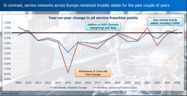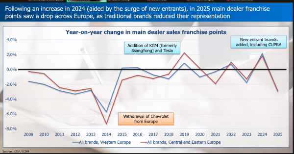 L’étude révèle qu’entre 2009 et 2025, les réseaux de concessionnaires ont diminué de près de 3 % en Europe de l’Ouest comme en Europe centrale et orientale. Cette tendance, amorcée depuis plus d’une décennie, s’explique par la rationalisation des réseaux et le retrait de certaines marques, comme cela a été le cas pour Chevrolet en 2014.