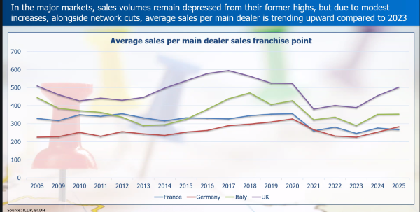 Autre indicateur, celui des ventes moyennes par concession principale. Ce dernier relève une forte concentration du volume. Le Royaume-Uni apparaît comme le marché le plus rationalisé, tandis que l’Allemagne reste “sur-dealerisée”, héritage d’un tissu historique dense lié aux marques nationales.