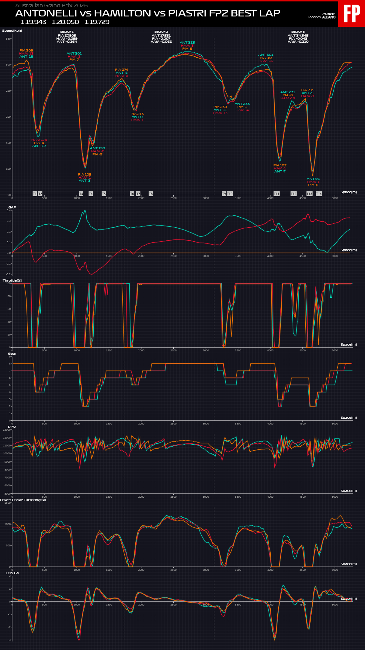 In the very long back straight, however, Antonelli’s Mercedes prevails, with a more concentrated delivery which leads to a slightly higher and more concentrated maximum speed, followed by a long cut in power which ends up costing over 40 km/h of speed, as predicted by the analyzes on the eve. The conservation of energy at the end of the long stretch towards turn 9 then allows the Italian driver to have a greater reserve for the subsequent sprint up to turn 11, where Antonelli clearly prevails. In the last sector the Mercedes number 12 comes very close to taking the best time of the session, recovering over 3 tenths of a gap throughout the critical section for the tyres. A further confirmation of the innate qualities of the W22 also in terms of tire management, and therefore not only at Power Unit level. An unclean exit from the final corner by Antonelli and a slightly lower level of available power compared to the competition left Oscar Piastri leader of the session. It should also be noted that only Russell and Antonelli conducted a fairly complete long run simulation, showing a very high consistency of high performance which makes them absolute favorites for Sunday’s race.